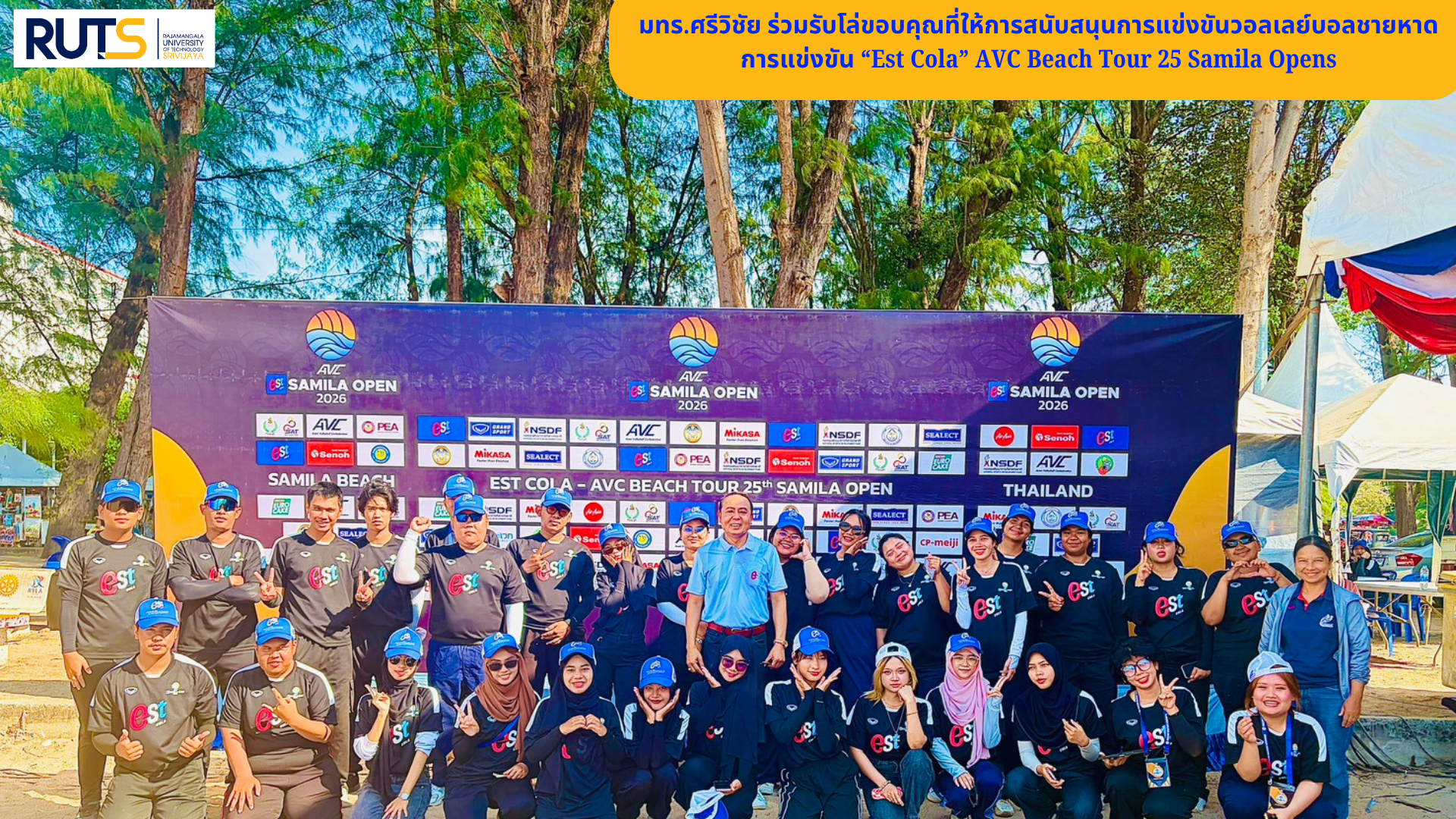 เมื่อวันที่ 15 เมษายน 2569 ศาสตราจารย์ ดร.สุวัจน์ ธัญรส อธิการบดี มอบหมายให้ ผศ.ปิยะ ประสงค์จันทร์ รองอธิการบดี มหาวิทยาลัยเทคโนโลยีราชมงคลศรีวิชัย ร่วมรับโล่ขอบคุณที่ให้การสนับสนุนการแข่งขันวอลเลย์บอลชายหาด การแข่งขัน ”Est Cola” AVC Beach Tour 25 Samila Opens ซึ่งจัดขึ้นระหว่างวันที่ 12 – 15 เมษายน 2569 ณ หาดสมิหลา จังหวัดสงขลา โดยจัดติดต่อกันมาเป็นครั้งที่ 24 เป็นการส่งเสริมกีฬาวอลเลย์บอลชายหาด สนับสนุนการท่องเที่ยว และร่วมเฉลิมฉลองเทศกาลสงกรานต์ของจังหวัดสงขลา โดยมหาวิทยาลัยเทคโนโลยีราชมงคลศรีวิชัย ได้จัดนักศึกษาเข้าช่วยงานดังกล่าวจำนวน 35 คน นักศึกษาทุกคนช่วยงานตั้งแต่พิธีเปิดในวันแรกจนถึงพิธีปิดวันสุดท้าย เป็นการร่วมมือที่ทำให้เห็นถึงความมีศักยภาพของนักศึกษามหาวิทยาลัยเทคโนโลยีราชมงคลศรีวิชัย