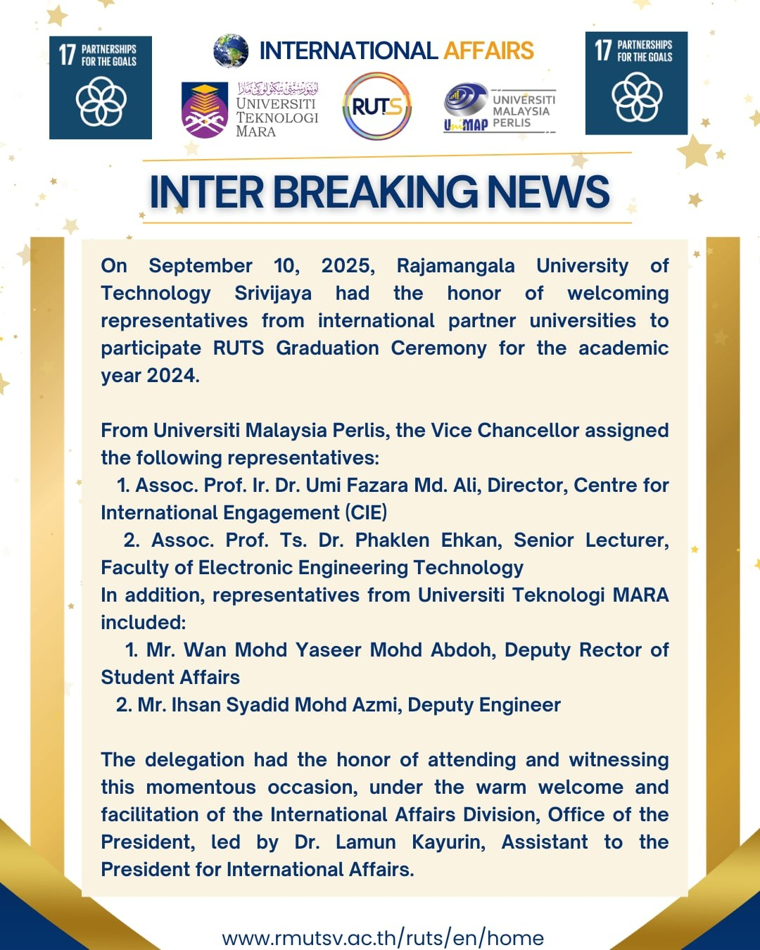 On September 10, 2025, Rajamangala University of Technology Srivijaya had the honor of welcoming representatives from international partner universities to participate RUTS Graduation Ceremony for the academic year 2024.