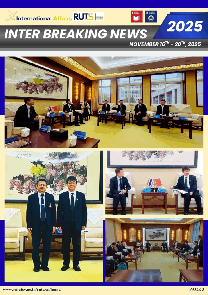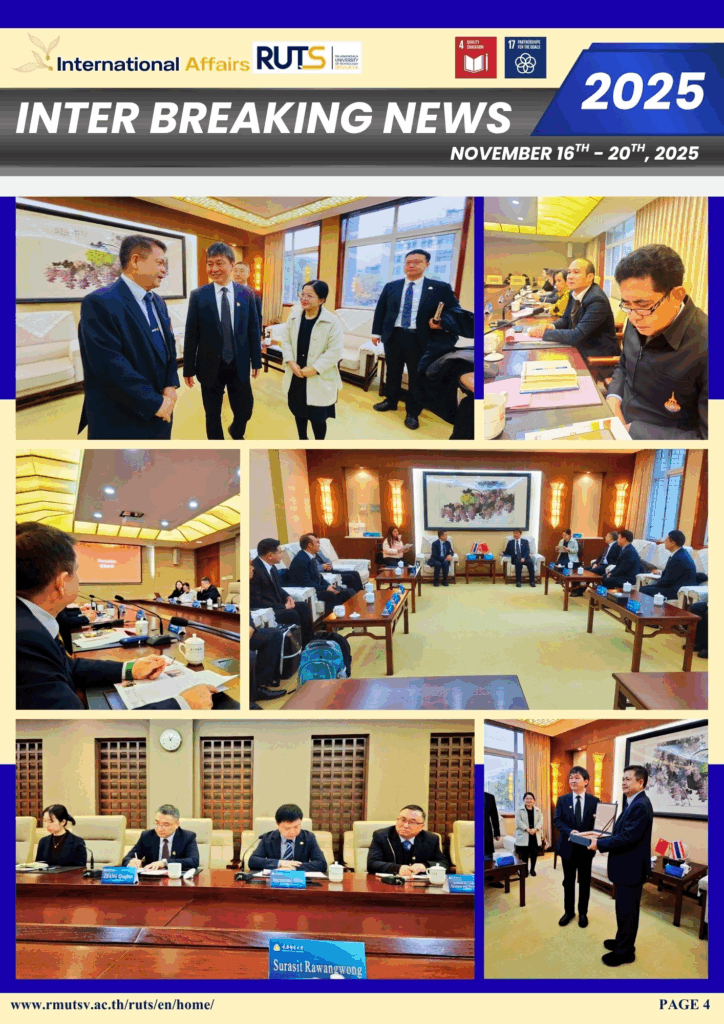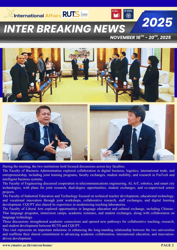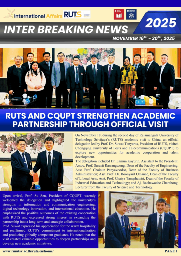 On November 18, during the second day of Rajamangala University of Technology Srivijayaโ€™s (RUTS) academic visit to China, an official delegation led by Prof. Dr. Suwat Tanyaros, President of RUTS, visited Chongqing University of Posts and Telecommunications (CQUPT) to explore new opportunities for academic cooperation and talent development.