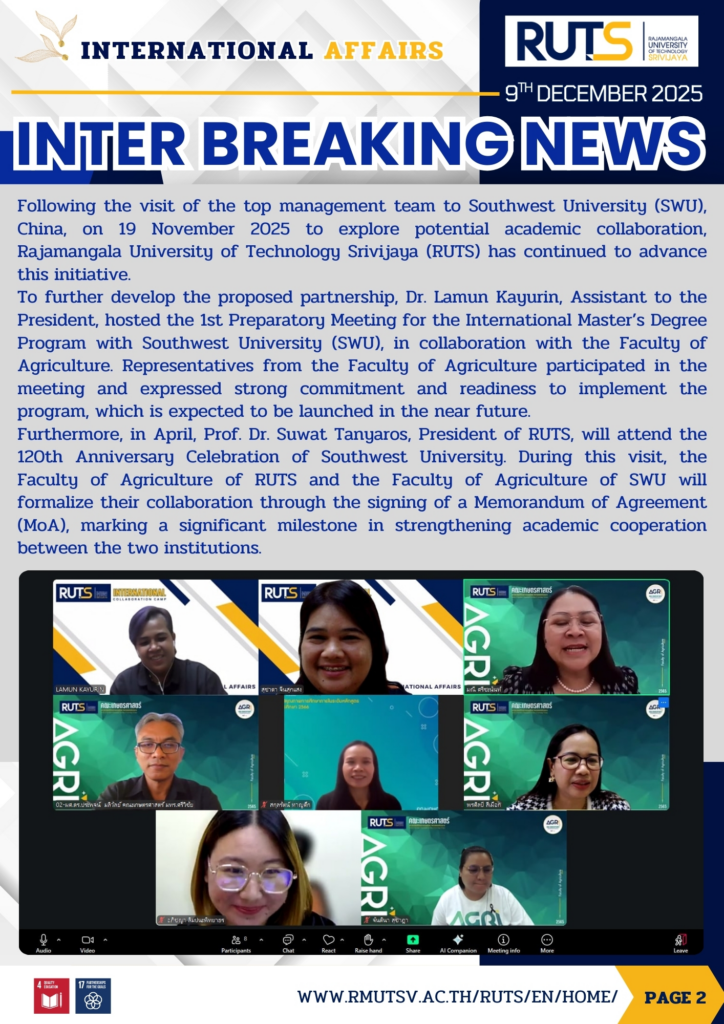 Following the visit of the top management team to Southwest University (SWU), China, on 19 November 2025 to explore potential academic collaboration, Rajamangala University of Technology Srivijaya (RUTS) has continued to advance this initiative. To further develop the proposed partnership, Dr. Lamun Kayurin, Assistant to the President, hosted the 1st Preparatory Meeting for the International Master’s Degree Program with Southwest University (SWU), in collaboration with the Faculty of Agriculture. Representatives from the Faculty of Agriculture participated in the meeting and expressed strong commitment and readiness to implement the program, which is expected to be launched in the near future.