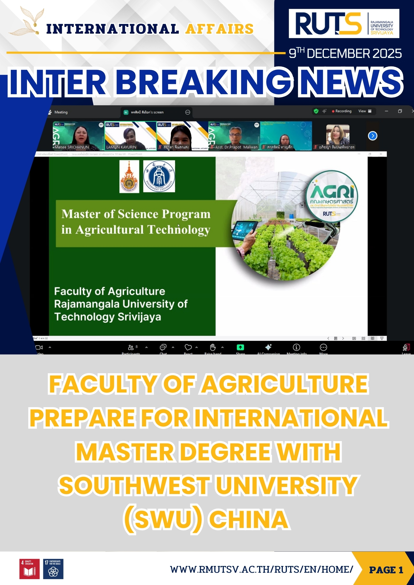 Following the visit of the top management team to Southwest University (SWU), China, on 19 November 2025 to explore potential academic collaboration, Rajamangala University of Technology Srivijaya (RUTS) has continued to advance this initiative. To further develop the proposed partnership, Dr. Lamun Kayurin, Assistant to the President, hosted the 1st Preparatory Meeting for the International Master’s Degree Program with Southwest University (SWU), in collaboration with the Faculty of Agriculture. Representatives from the Faculty of Agriculture participated in the meeting and expressed strong commitment and readiness to implement the program, which is expected to be launched in the near future.